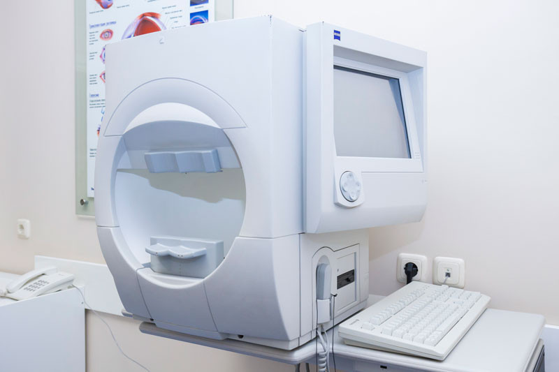 - Պերիմետրիա՝ անցկացվում է տեսադաշտի HFA (HumphreyFieldAnalyzer) անալիզատորի օգնությամբ։ Պերիմետրի մոդելը տրամադրում է բոլոր հիմնական հնարավորությունները՝ տեսադաշտում տեղի ունեցած փոփոխությունների հավաստի հայտնաբերման համար՝ այդ թվում դրանց սկզբնական փուլերում։ Քանի որ սկզբնական փուլերում կան միայն կենտրոնական տեսադաշտի դեֆեկտներ, որոնք չեն կարող հայտնաբերվել ոչ հիվանդի կողմից,ոչ էլ պերիմետրիայի այլ մեթոդներով։ Կիրառվում է նաեւ տեսադաշտի որոշման ստանդարտ մեթոդաբանությունը դասական աղեղային պերիմետրով;