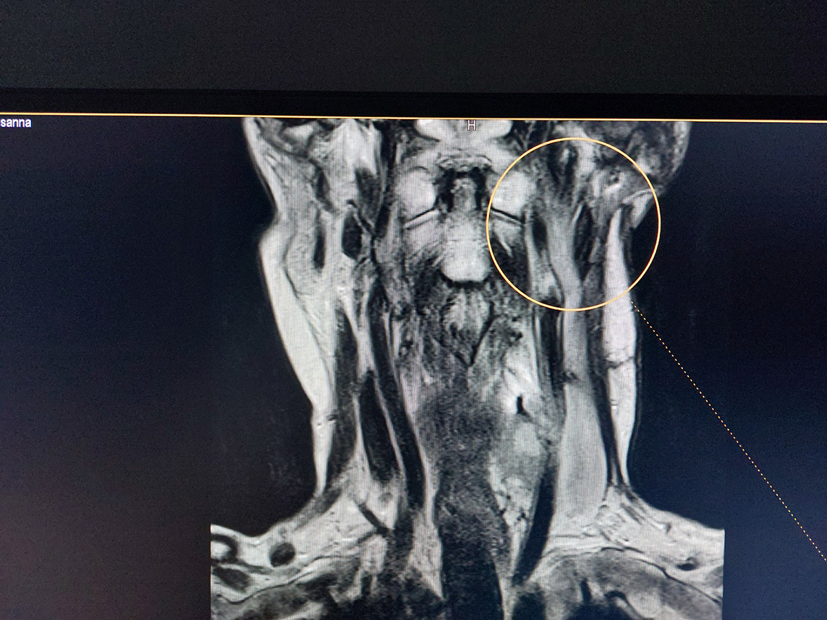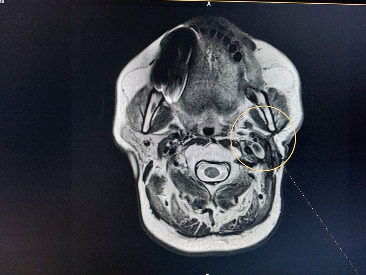 «Նաիրի» ԲԿ դիմել էր 66 տարեկան կին, մասնագիտությամբ` դերասանուհի, ով գանգատվում էր հարականջային շրջանում մեծ գոյացությունից՝ մոտավորապես 4 սմ։ Վերջին հինգ տարիների ընթացքում գոյացությունն աճել է դանդաղ, սակայն վերջին 2 ամսվա ընթացքում սկսել է կտրուկ աճել։
