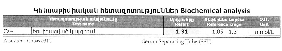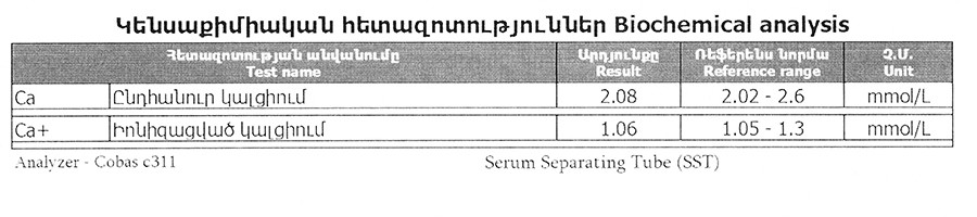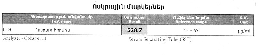 Վիրահատության հաջորդ օրը կալցիումն արյան մեջ նույնպես արդեն նորմայի սահմաններում էր, որը նախքան վիրահատությունը նույնպես շատ բարձր էր: Երկու շաբաթ անց կատարված հետազոտությունների արդյունքները նորմայի սահմաններում էին (պարաթհորմոնը, կալցիումը): Պացիենտը նշում էր ոսկրային ցավերի խիստ նվազում: