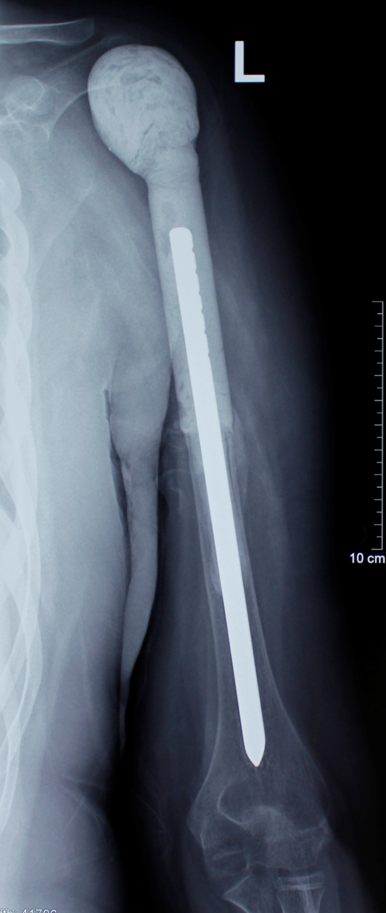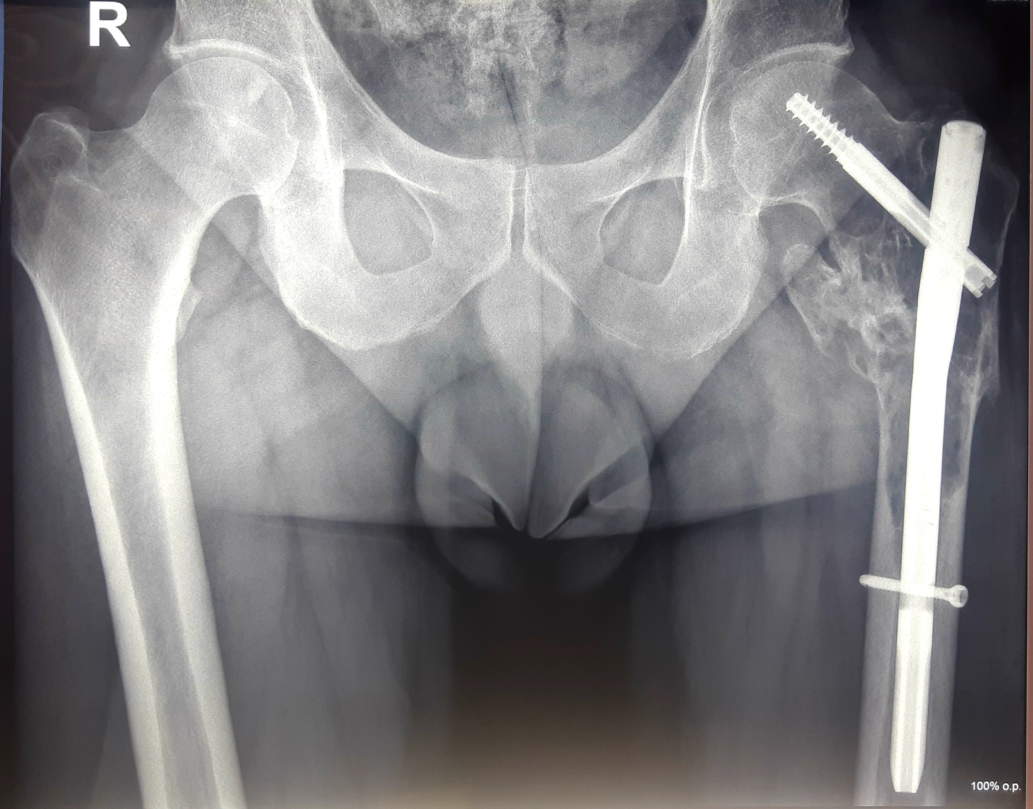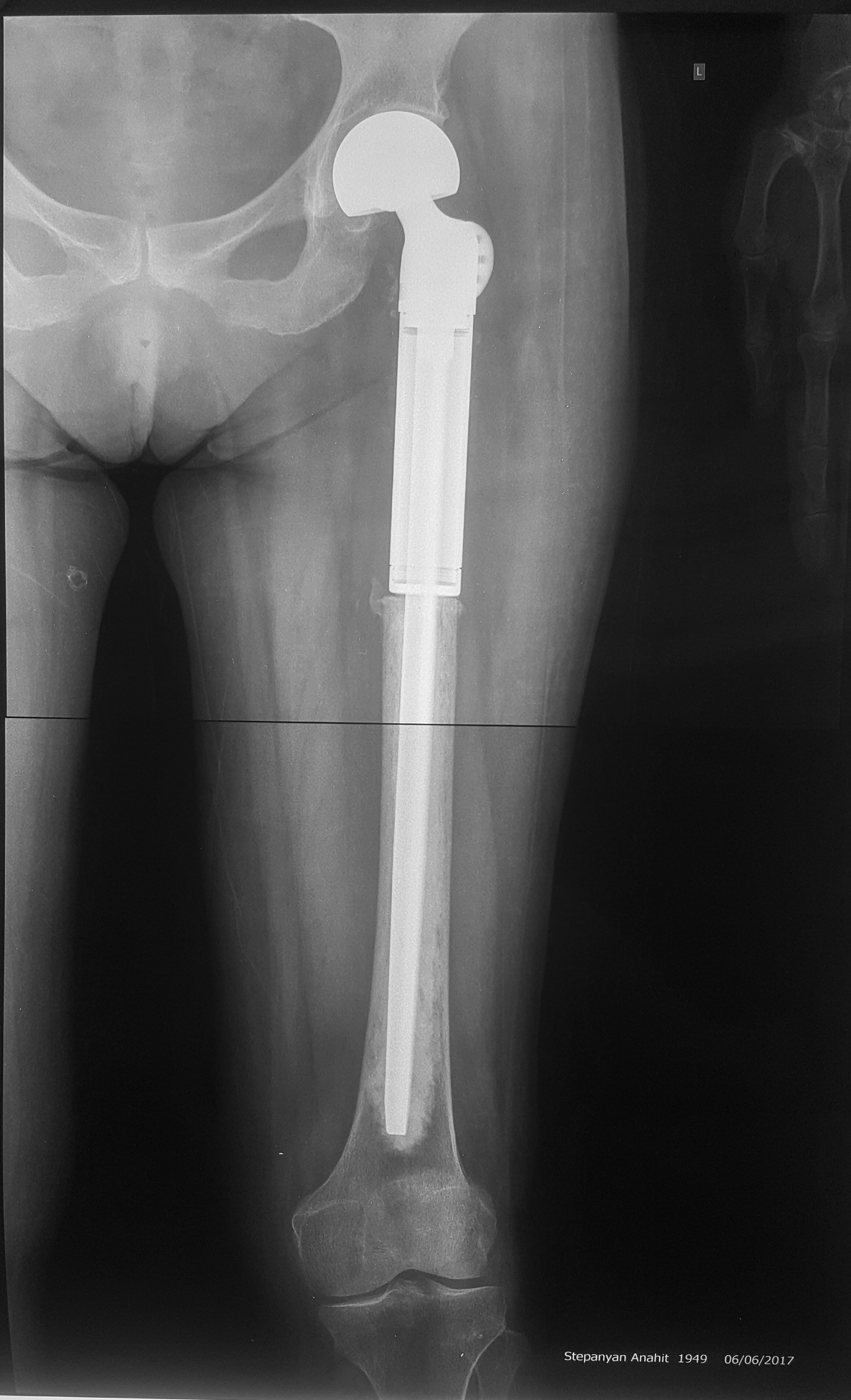 Пациентка 68 лет с ранее диагностированным раком легкого, получала химиотерапию, во время которого появились боли в тазобедренном суставе. В результате обследований был выявлен единичный метастаз в верхней трети бедренной кости с угрозой патологического перелома. Учитывая положительную реакцию организма на химиотерапию, чувствительность опухоли к лекарственным препаратам, была проведена радикальная операция. Во время операции была удалена верхняя треть бедренной кости, возникший дефект был восстановлен модульным биполярным эндопротезом, который позволяет сразу в зависимости от размера костного дефекта в ходе одной операции по принципу конструктора Lego восстановить дефект. Пациентка в дальнейшем получала послеоперационную химиотерапию, была предотвращена угроза патологического перелома, устранены боли, восстановлена функциональная пригодность оперированной конечности.